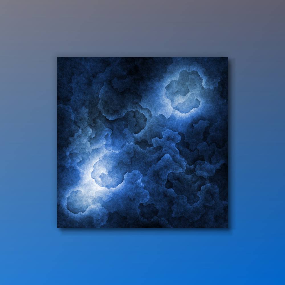 PC で制作した作品。画面上で、絵筆を扱うのと同様に「手描き」して、時間をかけて仕上げています。 通常の絵画や版画のような手作業感と深みを出していくことを意識しています。 鮮やかめの青色を 基調としています。