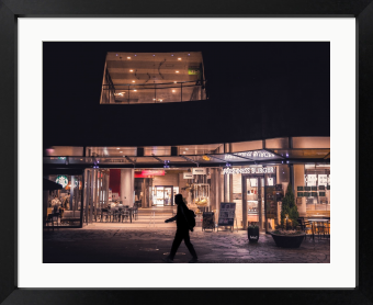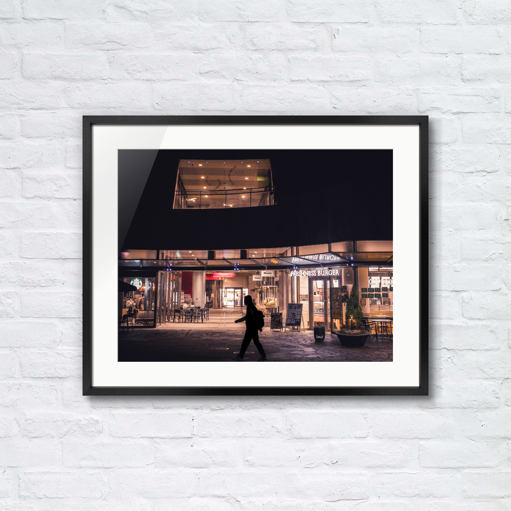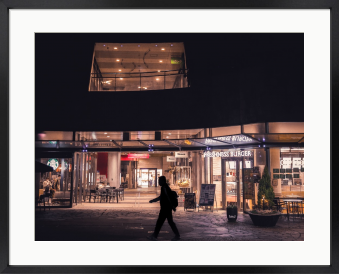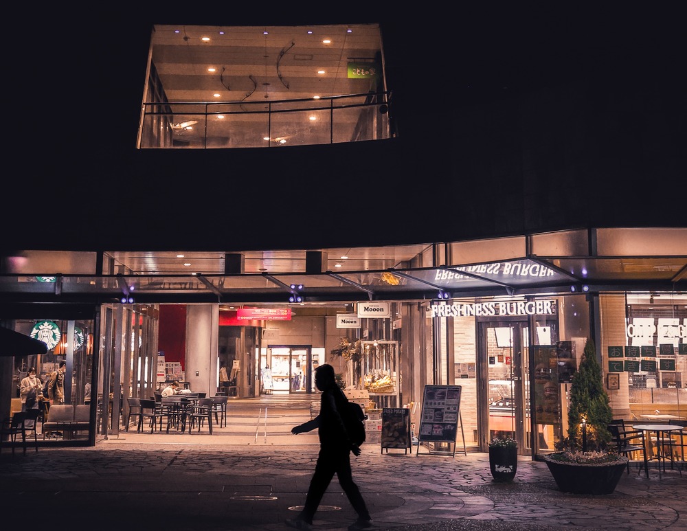 夜のショッピングモールを横切り帰宅する人を撮りました。 上下でメリハリを付けるためハッキリと色分けした構図にしオシャレな作品となってます。