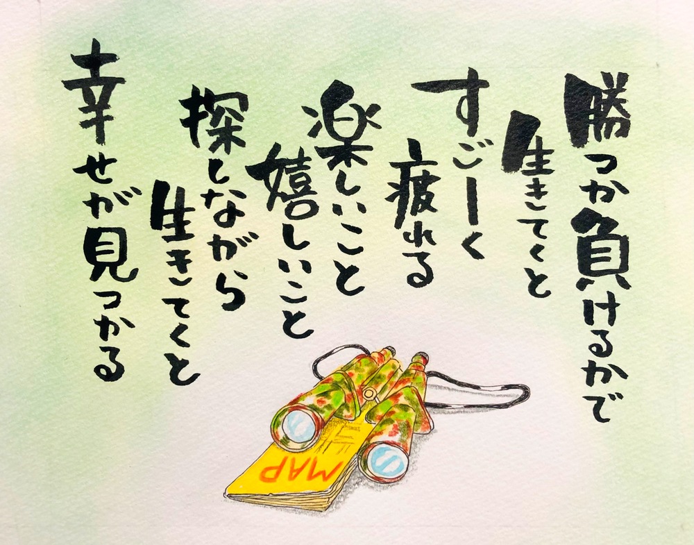 水彩•色鉛筆•墨 勝つことばっかりにこだわって生きてると、ヘトヘトにしかならない 楽しい事、嬉しい事を見つけながら、人生を探検するようにたまには道を間違えるかもしれない、それすら楽しみながら掴んだ幸せには物凄い価値があるはず。 だから一生懸命探すんだよ