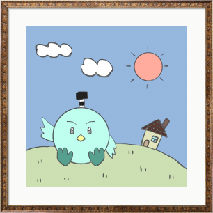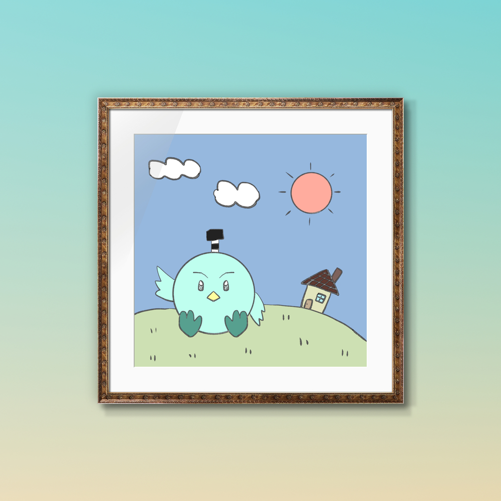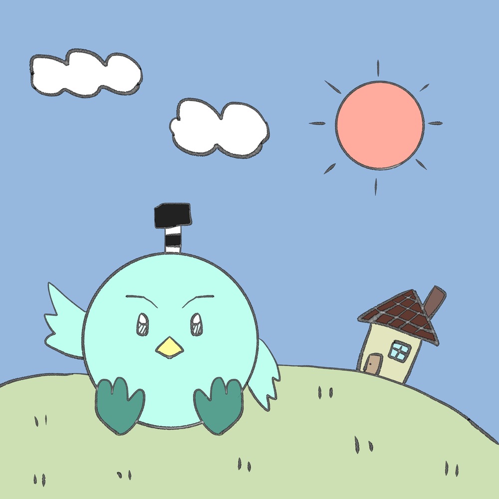 この作品は、青空の下、小さな家のある丘の上でくつろいでいるピヨを描いた絵です。