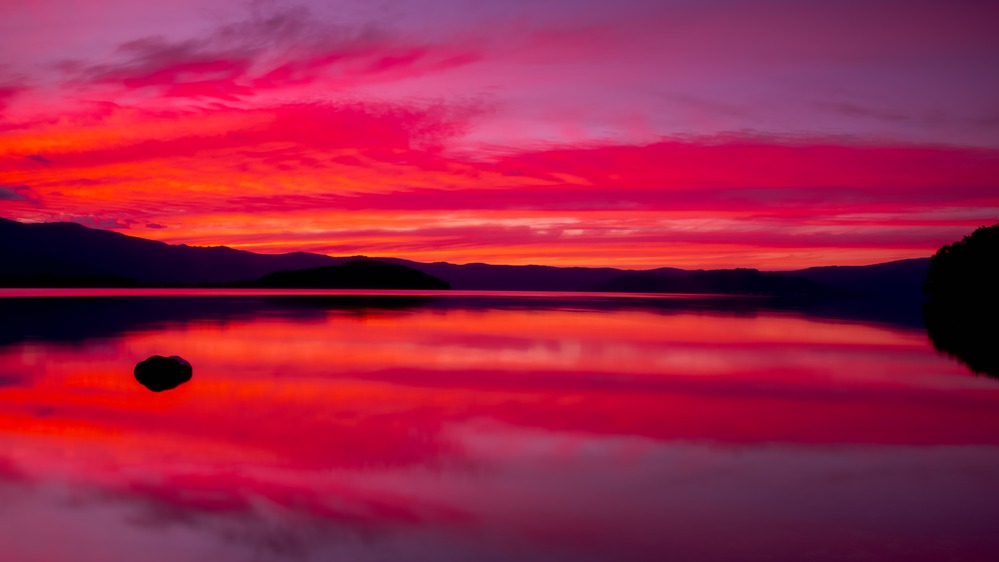 紅く染まる空の湖面に映る 燃ゆる夕暮れ 北海道 屈斜路湖