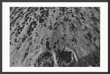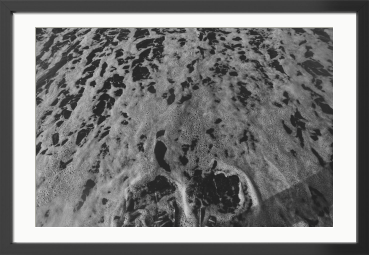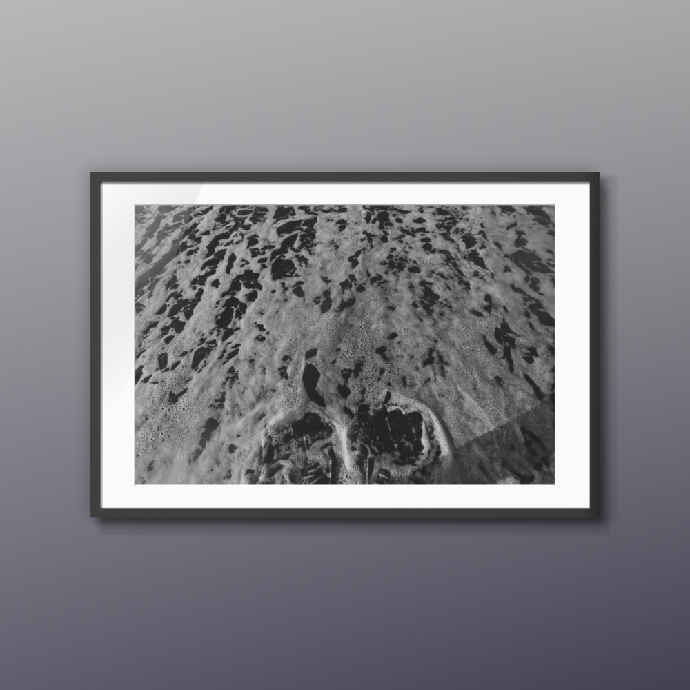 この高解像度モノクローム作品は、波が打ち寄せた後、水が引いていく瞬間の海辺の様子を、俯瞰に近いアングルで捉えています。