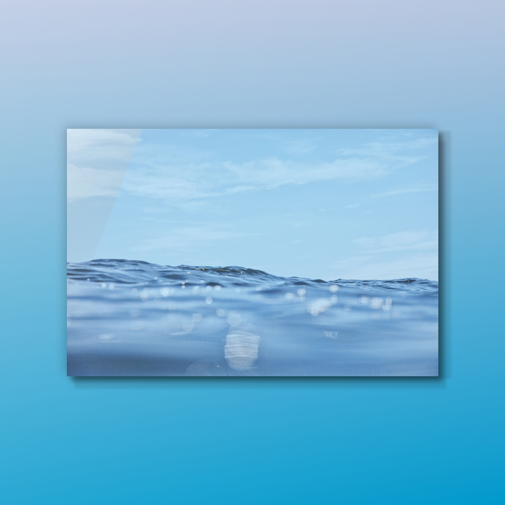 画面の半分以上を占める淡いブルーの空と雲、そして手前の穏やかな水面が、見る人に深いリラックス効果をもたらします。波は穏やかにうねり、まるで絹のような滑らかな質感を湛えています。