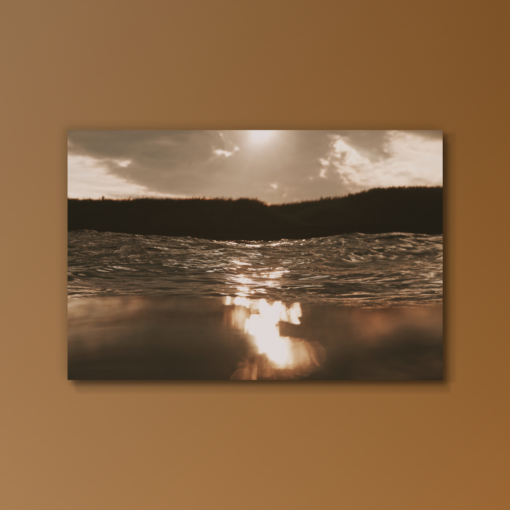 • ドラマチックな空: 雲が浮かぶ空から差し込む太陽(または強い光)が、作品の上部にドラマを加え、下部の水面の輝きと呼応しています。
