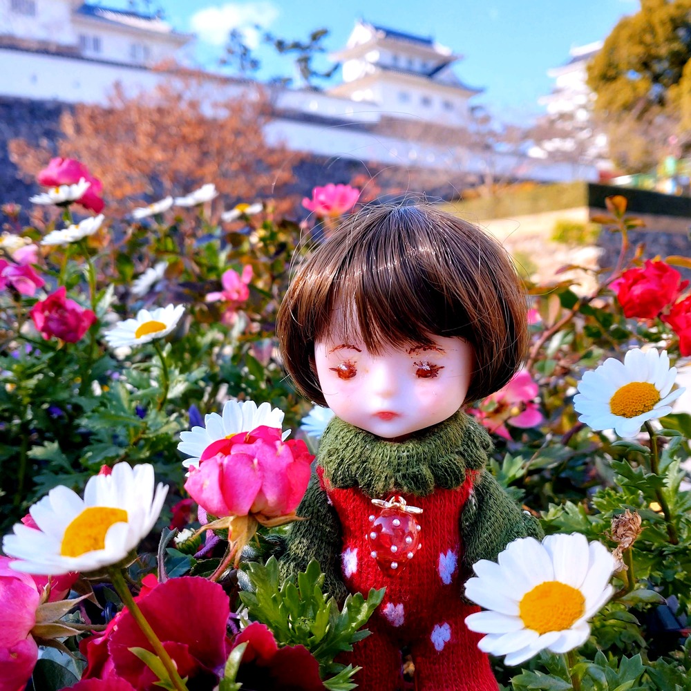 自作のドールと季節のお花の写真です 後ろに移っているのは福山城です ほっこりしていただければ嬉しいです