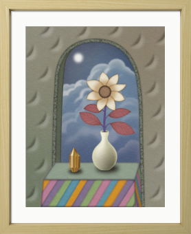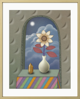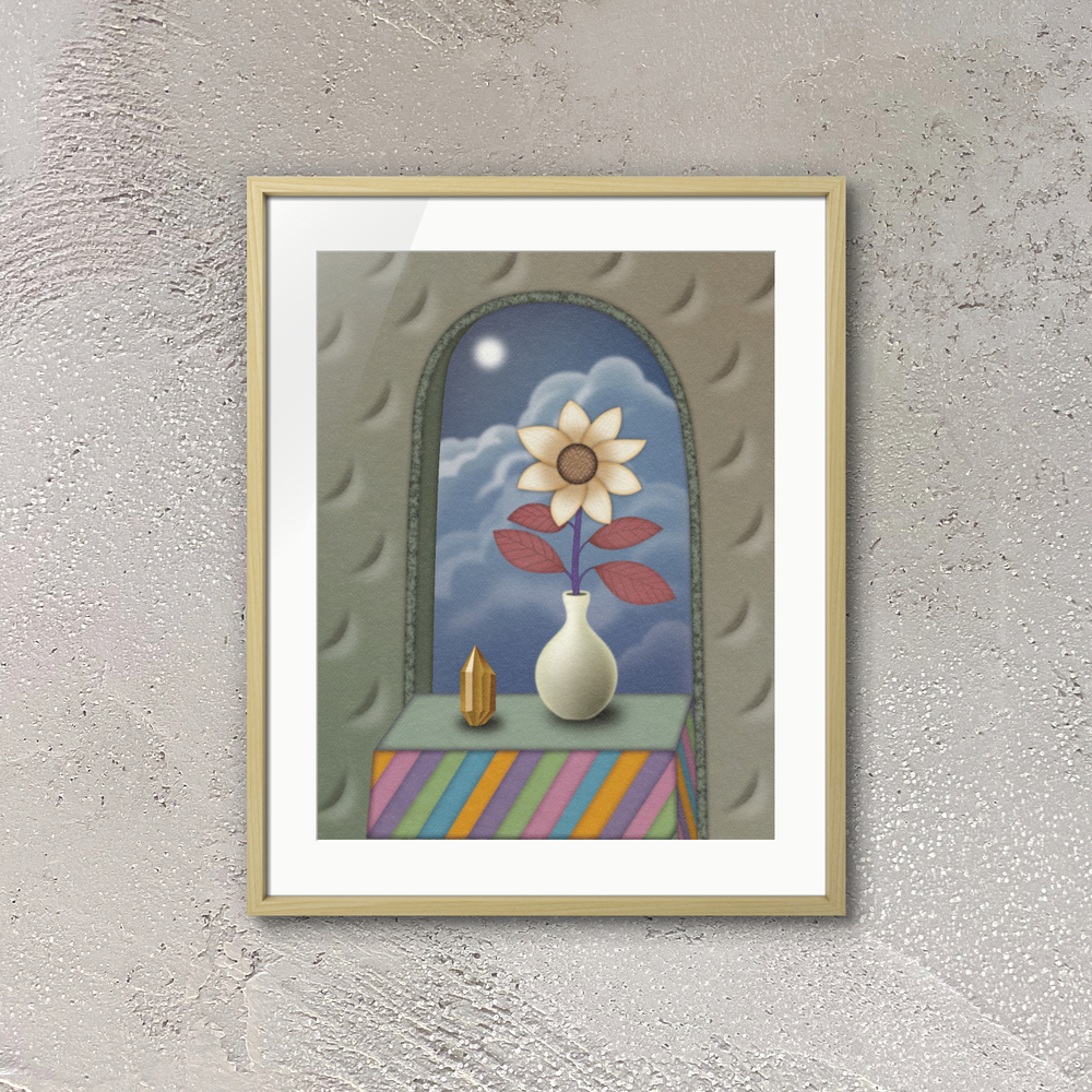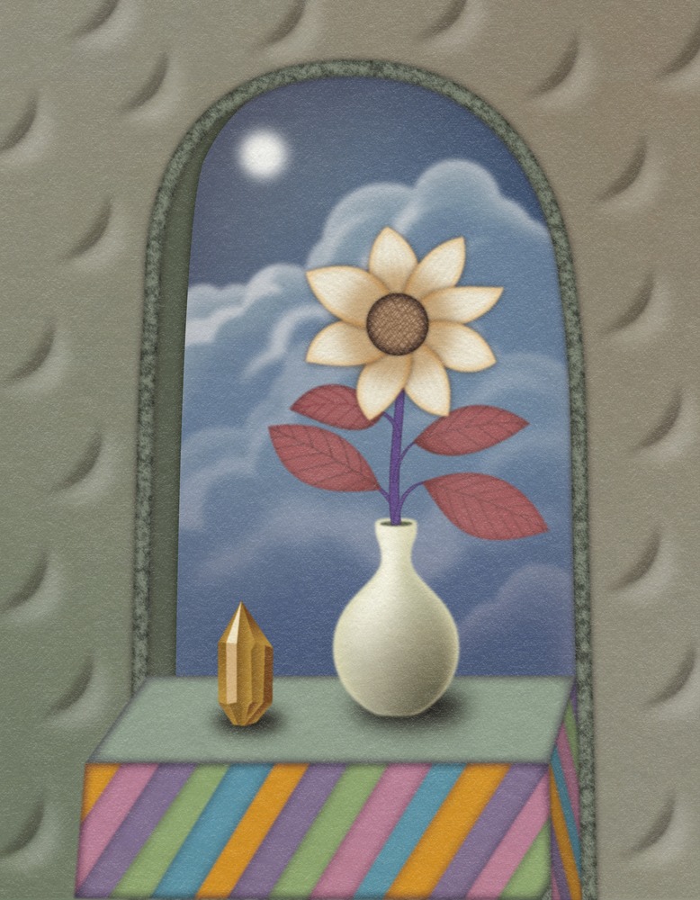 窓際の白い花瓶。外は昼のような夜のような曖昧な時間。静けさが漂う。