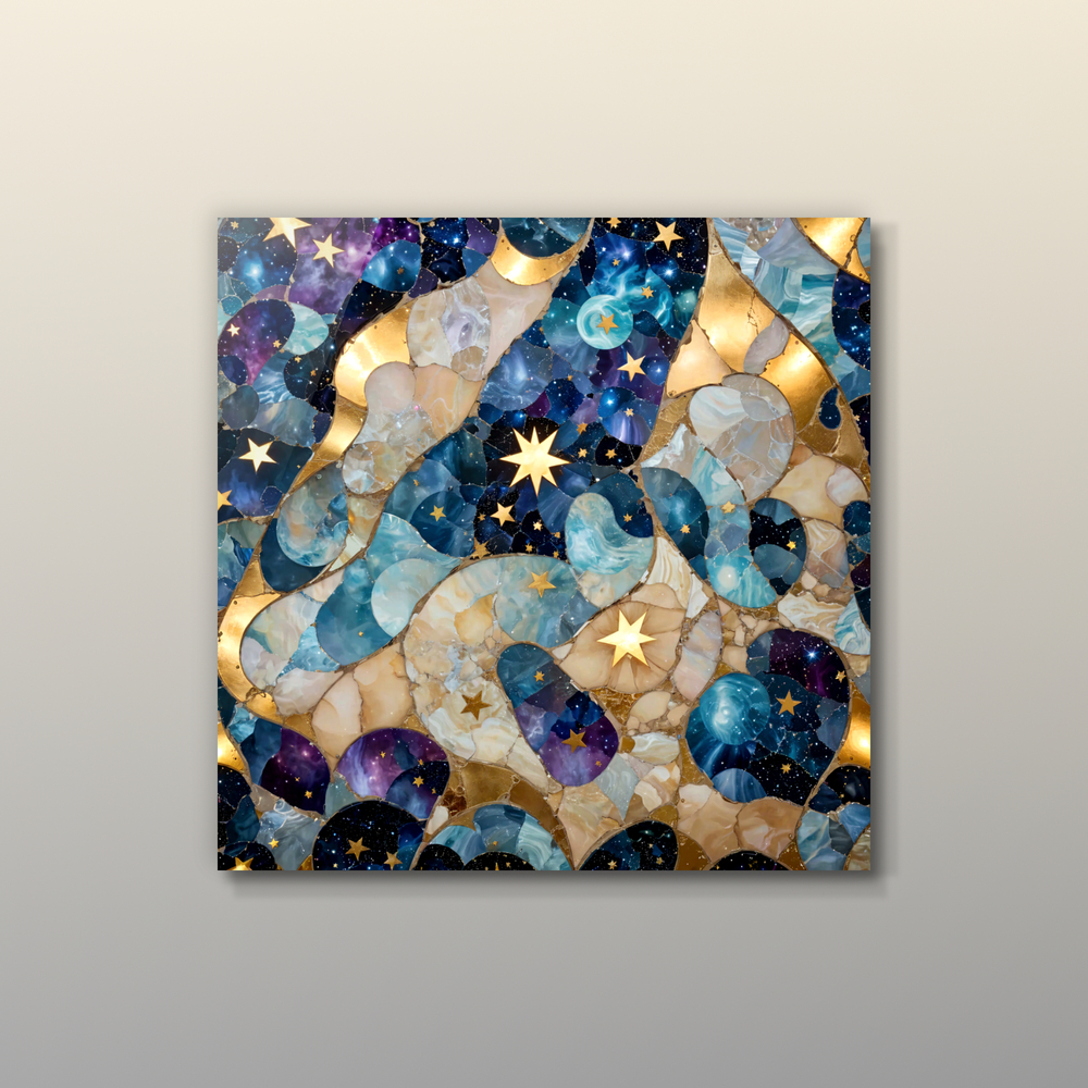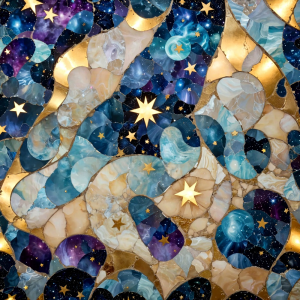 空と海が互いに惹かれ、優しく語り合っています。深い青と輝く金色は、星空と波が出会う瞬間を表現しています。空が海に光を送り、海が空を抱きしめるように、それぞれが共鳴し、調和する姿を想像しながら一つ一つの形を丁寧に重ねました。星々の煌めきや渦巻く模様が、広がる宇宙と果てしない海のつながりを感じさせてくれるでしょう。見るたびに新たな物語が生まれる、そんな静かで力強い絆を楽しんでいただけたら嬉しいです。