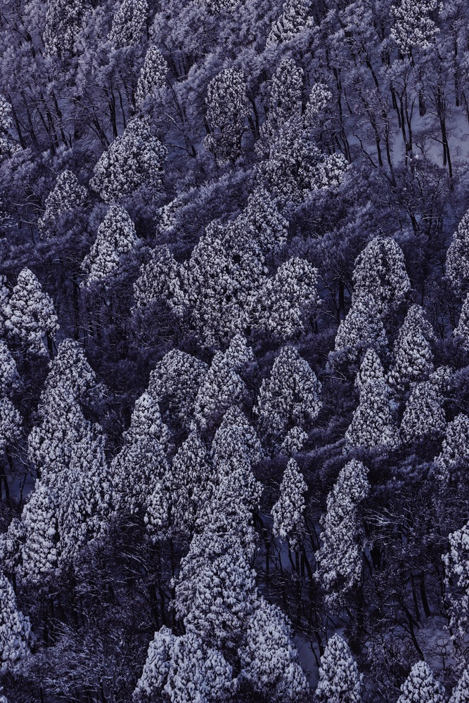 • 白い雪をまとった木々が規則的なパターンを作り出し、視覚的な奥行きとリズムを生んでいます。