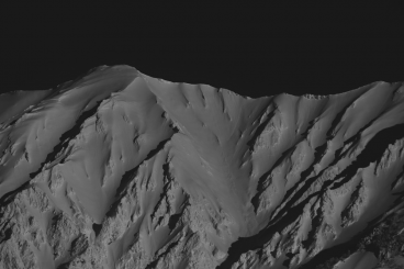 この高解像度作品は、雪と岩肌が織りなす山脈の壮大で峻厳な姿を、無彩色で表現した力強い写真です。