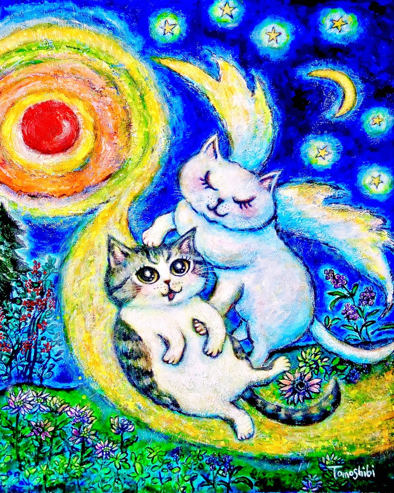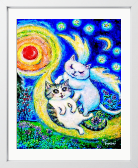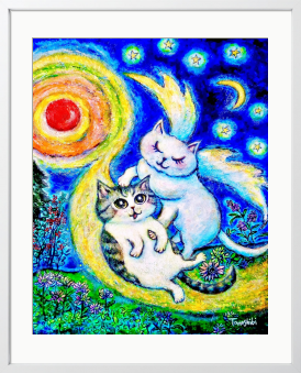 三日月の夜に 全ての生命を癒すという 不思議な太陽の光が降り注ぎ 優しい天使猫がそっと舞い降りる 秘密のパワースポットです *お好みの用紙や額などカスタマイズ可能です。 *画像はシュミレーションのため、実物は絵の上下左右が3ミリ程度マットに隠れます。