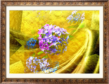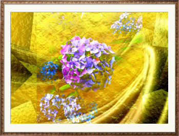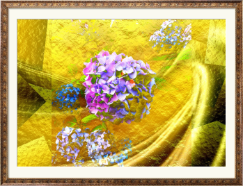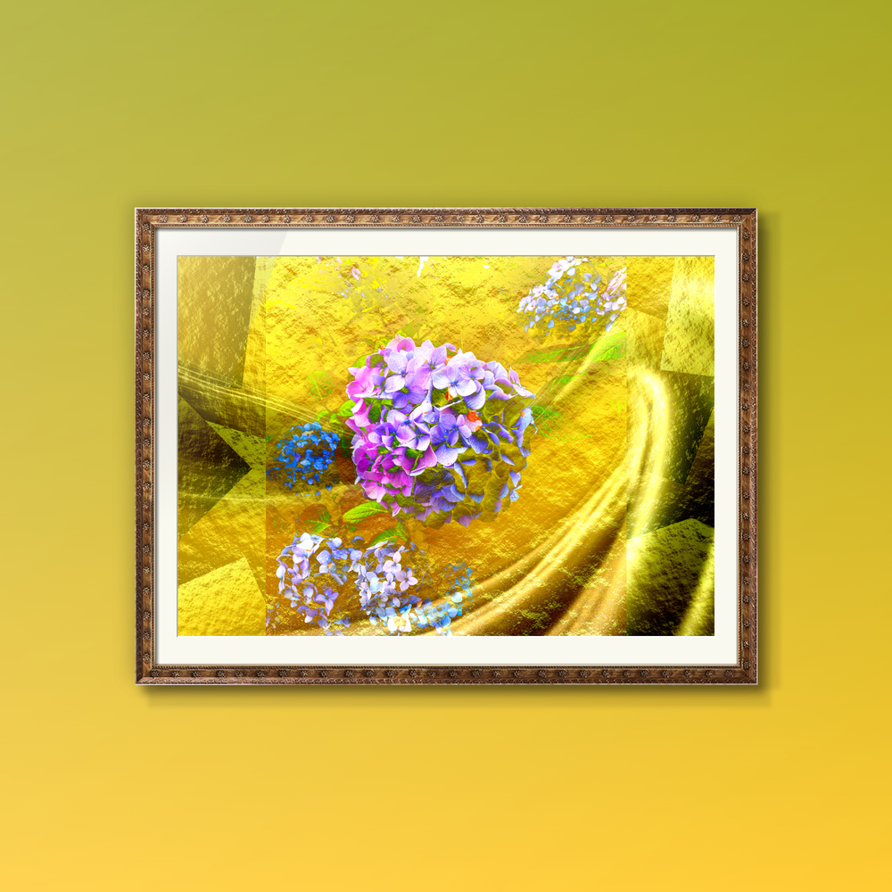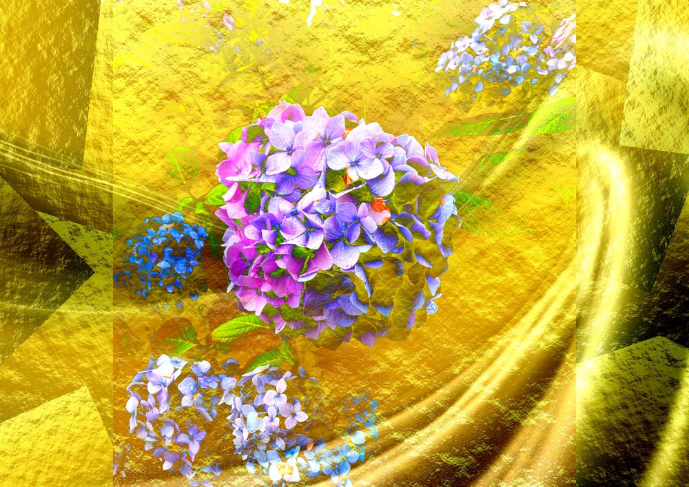 作品は、金箔の中に埋め込まれた紫陽花をイメージし表現している。 原産地が日本である紫陽花は、梅雨の時期に咲き、多くの場所で見られる。 雨は、恵みもあれば、災いも起こす。人は天気を変えることはできないが、考え方は柔軟に変えることはできる。 水の少ない地域であれば、水は黄金よりも勝る。水が豊かな地域であれば、黄金は水に勝る。 金箔に埋め込まれた「水に濡れた紫陽花」は、あなたの感性と価値観を試している。