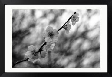 咲き誇る白梅の儚さをモノクロで表現しました。光と影のコントラストが花弁の質感を際立たせ、色を削ぎ落とすことで、より深い情緒が感じられる作品です。