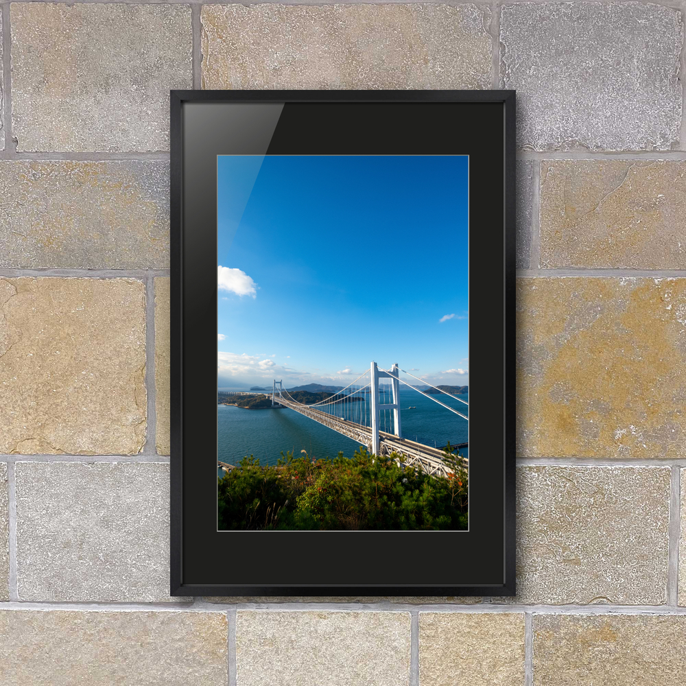 下津井瀬戸大橋は、瀬戸大橋の10の橋のうち最も北に位置し、本州 岡山県児島に接続した吊り橋です。 全長1447m、2つのメインポストに支えられた吊り橋構造を持ち、鉄道と道路の併用橋です。 鷲羽山展望台からの雄大な眺めを表現しました。