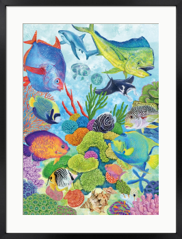 シイラやアカマンボウなど、様々な海の生きもたちが集まる海の楽園をカラフルに描いた作品です。