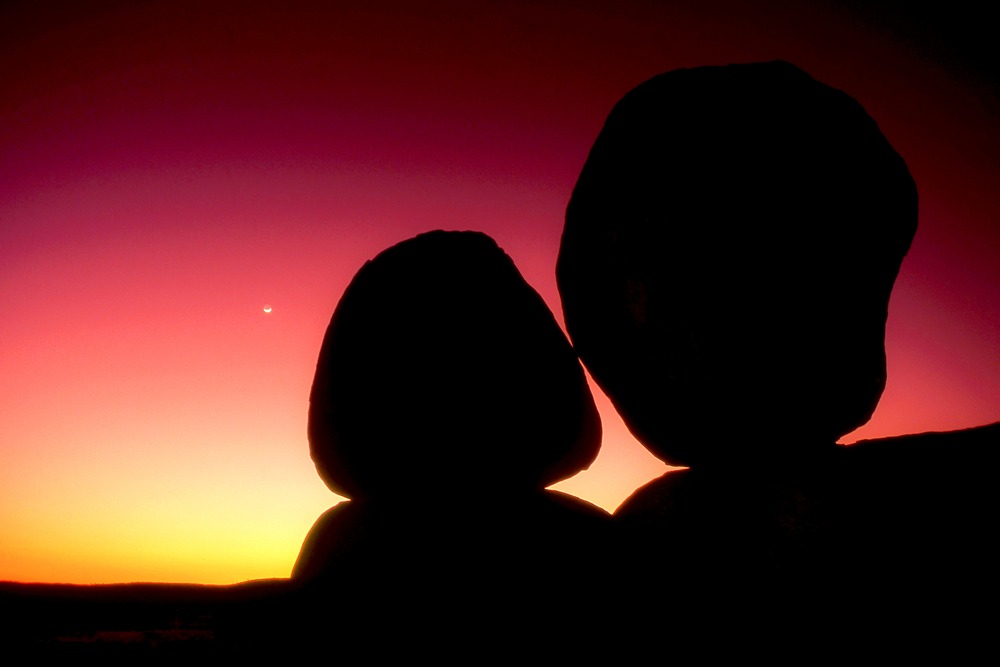 オーストラリア、ノーザンテリトリーの Karlu Karlu (Devils Marbles) の夕暮れの光景。付近には花崗岩の丸い巨岩が散在しています。(フイルム作品)