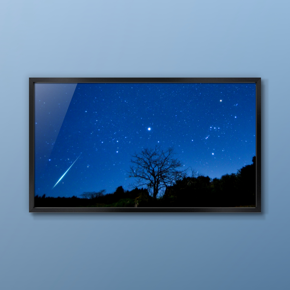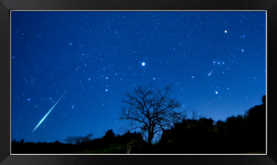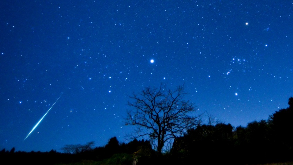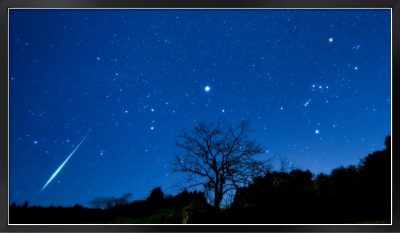 冬の星座の中を流れる「ふたご座流星群」の明るい流星です。写真右手に「オリオン座」、中央の輝星は「おおいぬ座」のシリウスです。