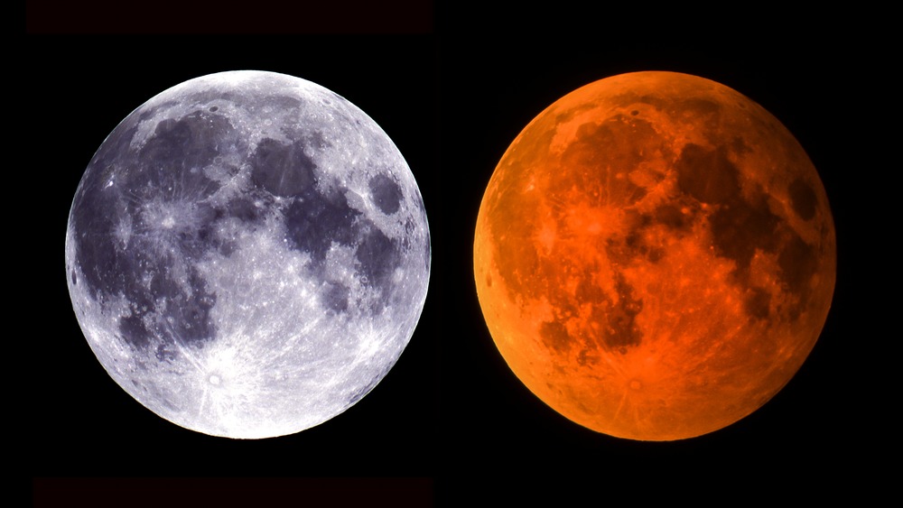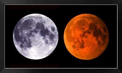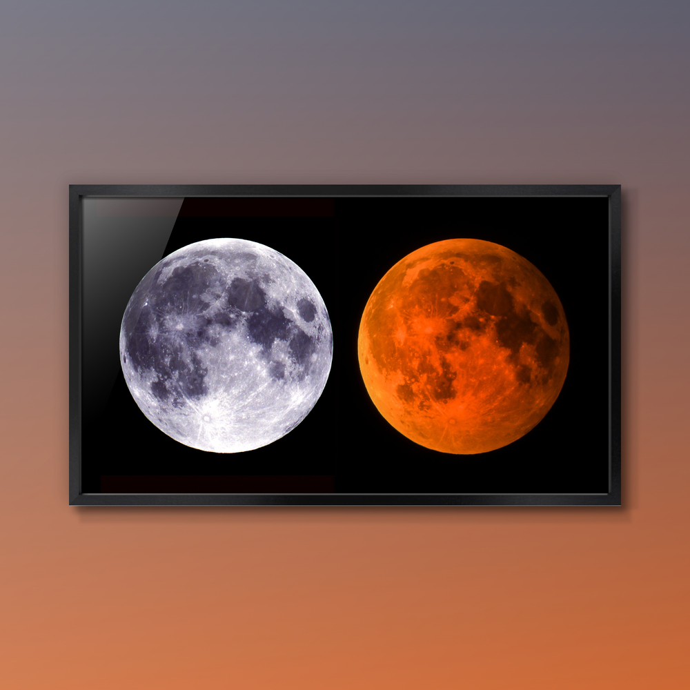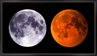 通常の満月(左)と皆既月食中の赤い満月(右)です。この作品は肉眼で立体視ができるように作られています。交差法(左の写真を右目、右の写真を左目)で見ると、月が立体的に球形に見えます。(フイルム作品)