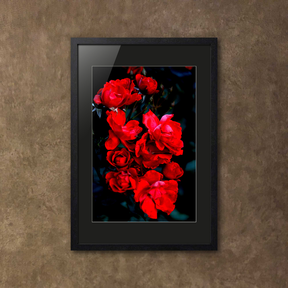 朝日が昇る前の、夜露に濡れた紅薔薇🌹です。深い色合いの花びらに夜露の水滴がビロードのような効果を与えています。