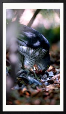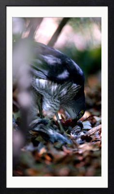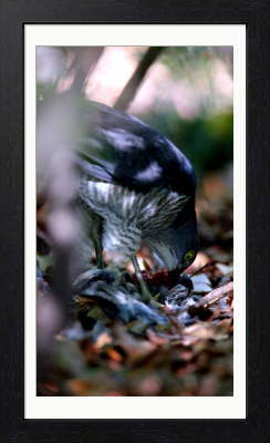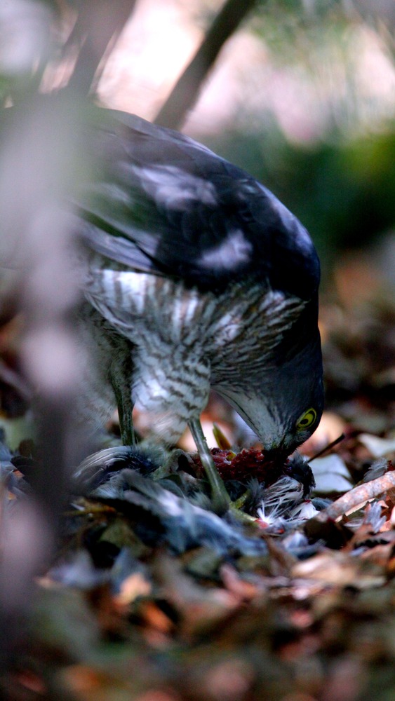 公園の植え込みの中で掴まえた獲物(ムクドリ)を貪るツミ(雀鷹)の雌です。もうすぐ卵を産む時期なので、本来ならば雄が獲物を持ち帰るのを待つ筈ですが、なかなか戻って来ない雄にしびれを切らして自分で狩りをしました。
