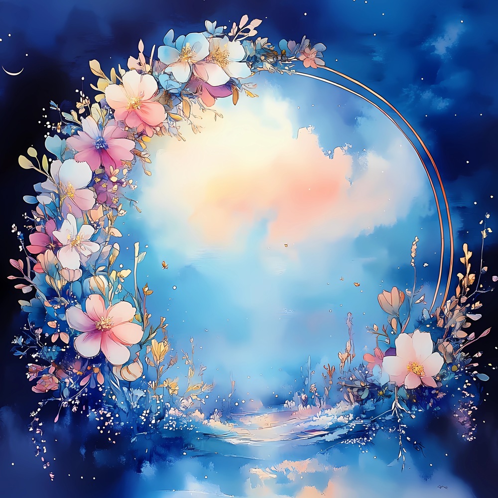 静寂に包まれた蒼の夜空。 空に咲いた花々が、半円の輪を描きながら優しく揺れる。 それは天秤座の象徴、調和の花環。 春の風に乗って、心の重さがそっと解けてゆく。 桃色に染まる雲の向こうに ピンクムーンが静かに微笑み、 今ここにいることの奇跡を、光のしずくで語りかけてくる。 花と月と、星々と。 すべてが繋がるこのひととき。 内なる宇宙と外の世界が、優しく重なり合う夜。