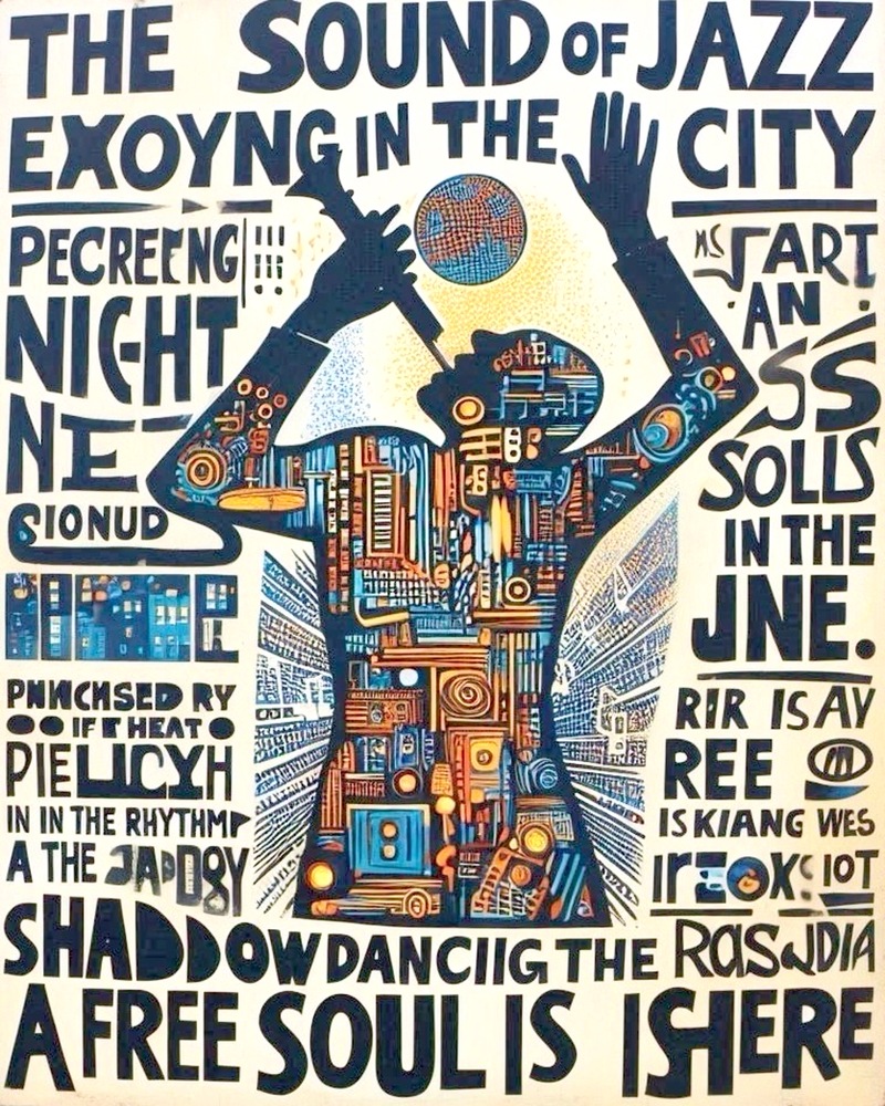iPadで描いたデジタル画です。 タイトルを「 Urban Jazz Reverie 」と、付けました。 こちらの作品は、ぼくの好きなジャズをモチーフに、ジャズの自由な魂と都市の躍動感をイメージし、都会の夢想とジャズの流れを融合ということを意識して描いています。