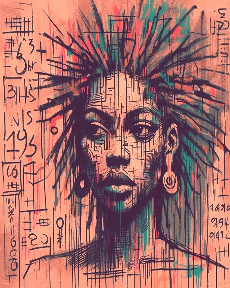 iPadで描いたデジタル画です。 タイトルを「 19568コード 」と、付けました。 こちらの作品は、数字やラインの奔放な動きが視覚的なリズムを生み出し、まるで暗号めいた物語が隠されている・・というイメージで描いています。