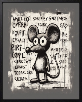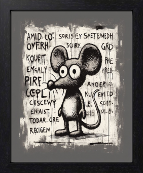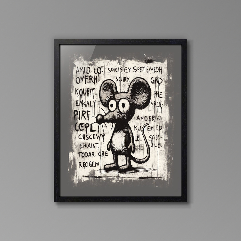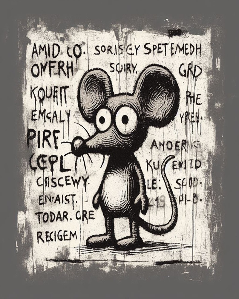 iPadで描いたデジタルイラスト画です。 タイトルを「 ノイズの中のマウス 」と、付けました。 こちらの作品は、モノクロのスケッチに散らばるナンセンスな言葉たちが、どこか夢の断片を覗き見るようなイメージで、混沌とした言葉たちの中に佇む小さな存在にフォーカスを当てて描いた作品です。