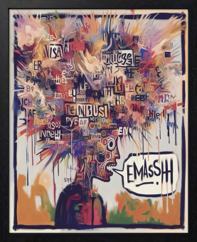 iPadで描いたデジタル画です。 「 言葉の肉体 」と、タイトルを付けました。 こちらの作品は、文字がそのまま身体となって訴えかける姿に焦点を当てたイメージで、意味のない言葉そのものが存在を揺るがしているような印象になっています。