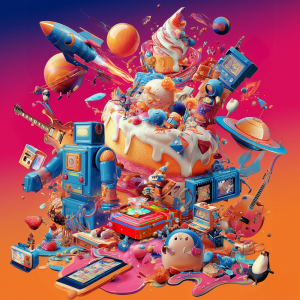 溶けるお菓子、踊るロボット、飛び出すゲームとレトロTV。重力も時間も関係なく、遊びの粒子たちが宇宙のように広がっていく。理性ではとらえきれない、心がほどけるような楽しさの奔流。