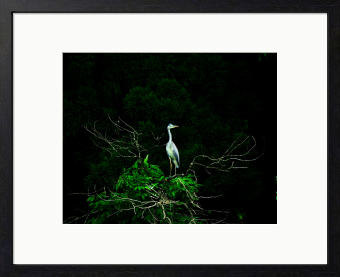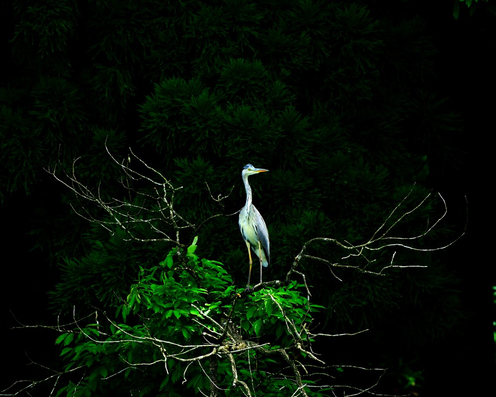 鬱蒼と茂る森を背景に、初夏の日の光を浴びて佇むアオサギです。