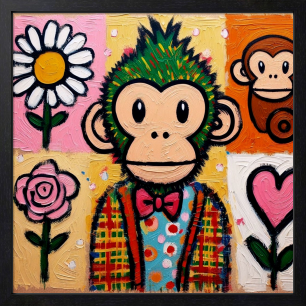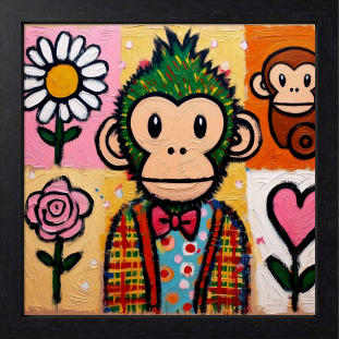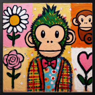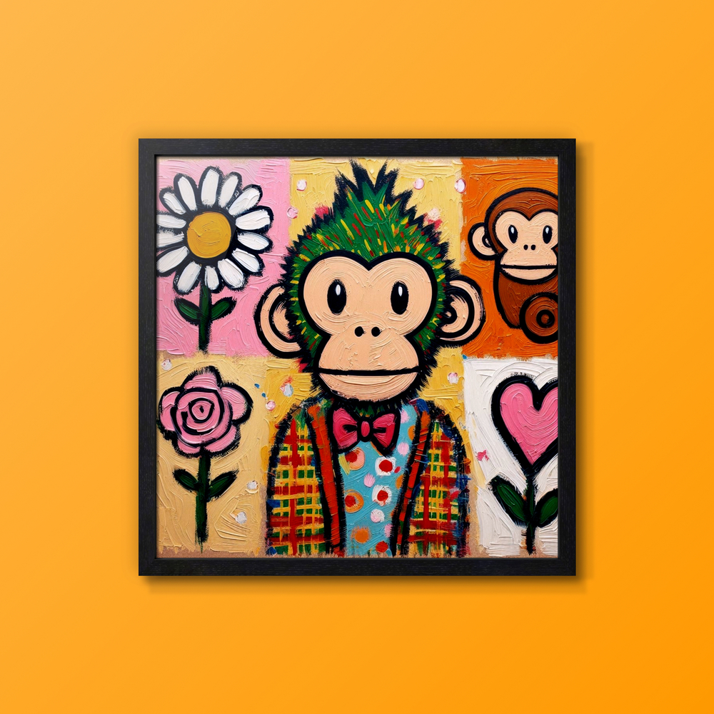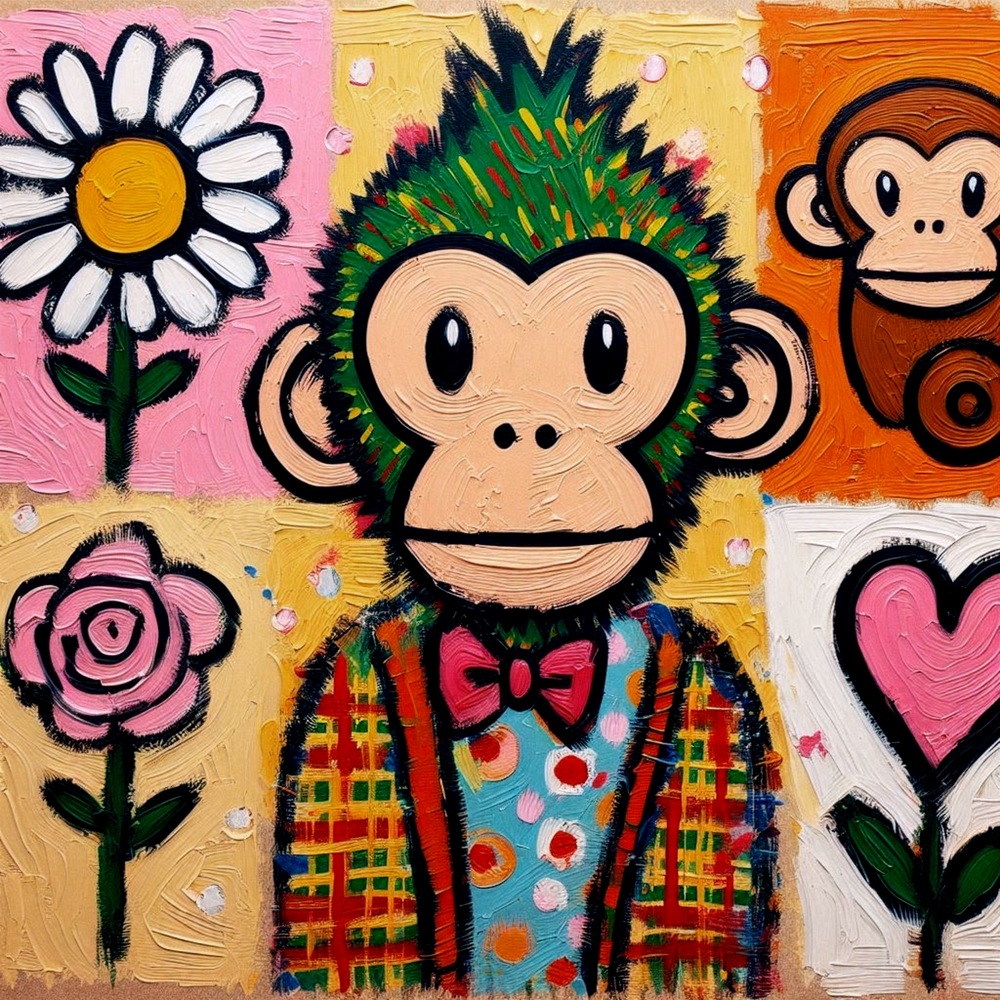 iPadで描いたデジタル画です。 「 MONKEY POP 」と、タイトルを付けています。 こちらの作品は、モンキーのキャラクターと周囲のシンボルが、まるでポップアートと絵本の世界を融合させたような印象になっているのではないでしょうか・・・。