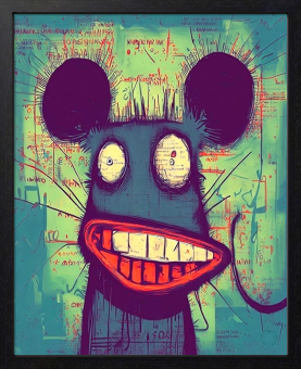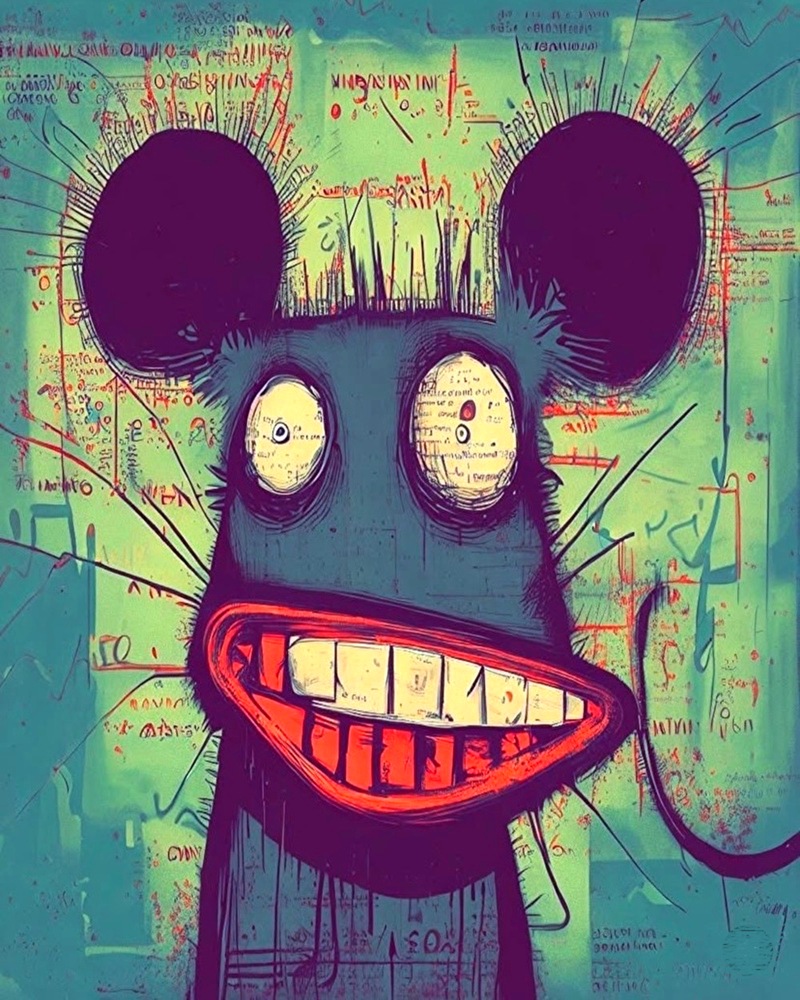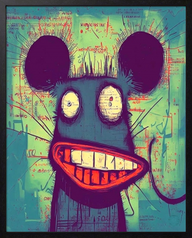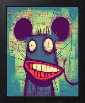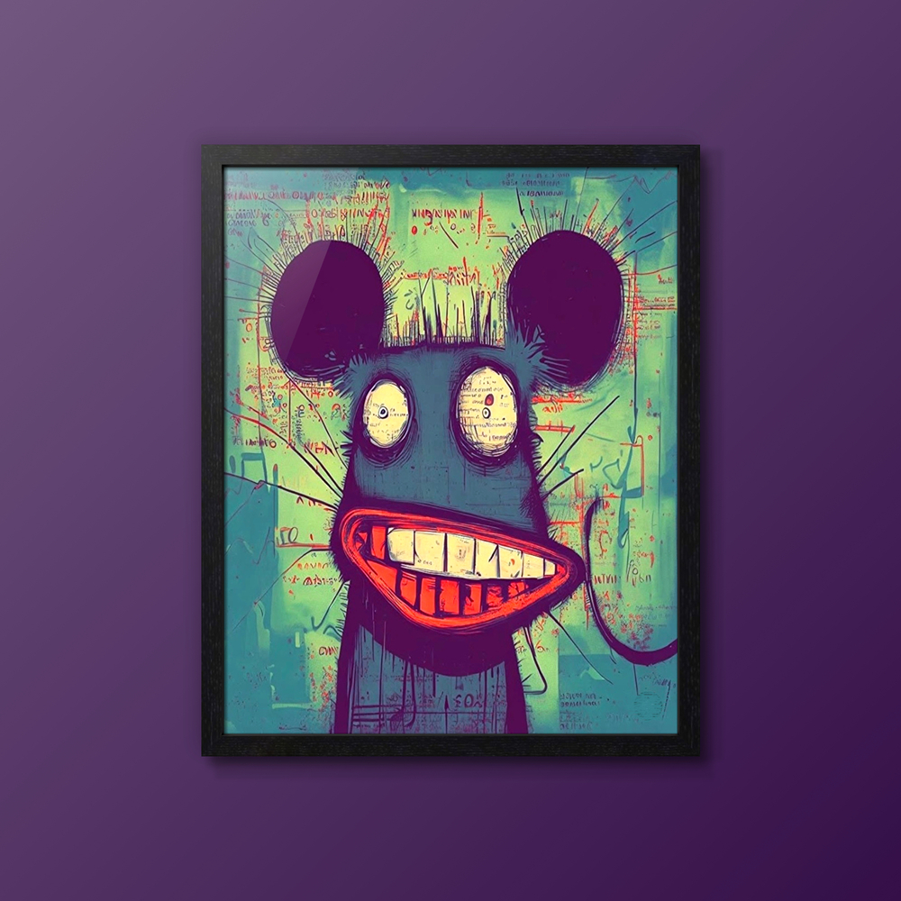 iPadで描いたデジタル画です。 タイトルを「 方程式の奥で笑うネズミ 」と、付けました。 こちらの作品は、いつも私がモチーフにしているネズミのキャラクターを用いて、ユーモアと知性が交差する世界をイメージし、ポップアート風に仕上げた作品です。