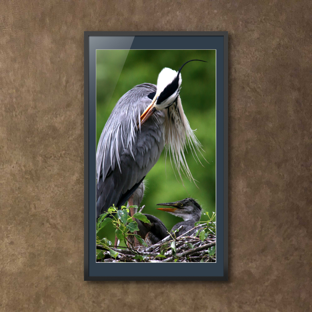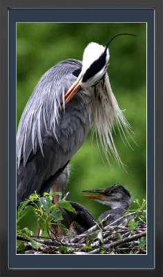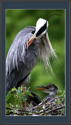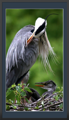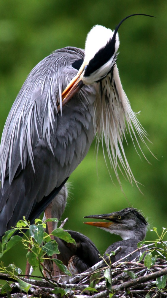 鷺のコロニーの一角で子育て中のアオサギ。二羽の雛は順調に育っています。