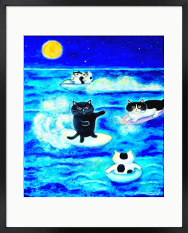 流れ星の飛ぶ星空の夜 誰も知らない秘密の海で マリンスポーツを楽しむ モノトーンの猫さんたち *お好みの用紙や額などカスタマイズ可能です。 *画像はシュミレーションのため、実物は絵の上下左右が3ミリ程度マットに隠れます。