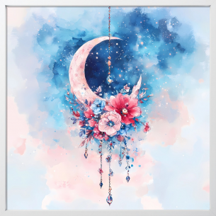 夜空に静かに浮かぶ三日月は、花々の光をまとい、星々の囁きを受けとめる夢の装飾。 淡いブルーとピンクの空は、幻想と現実の境界をやわらかく溶かし、 揺らめく宝石のような光は、心の奥に眠る願いをひそやかに映し出す。 この絵は、月と花と星が紡ぐ「魂のオーナメント」。 見る人の心に、安らぎと希望をそっと灯します。