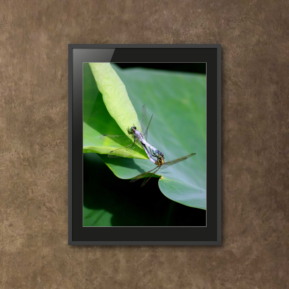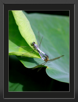 雄と雌が連なって二匹で行う「タンデム飛行」を終えて蓮の葉の上で休息するオオスオカラトンボです。 二匹くっついているのは、単に絆を確かめ合っているのではなく、雄から雌に精子を渡す生殖行動(交尾)らしいです。 オスの腹部(基部近く)にある副性器には生殖口から移された精子が蓄えられているので、雌は生殖口をそこに密着させて精子を受け取っているのだとか!?
