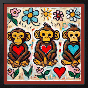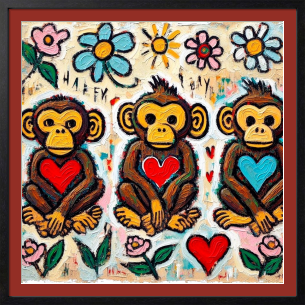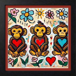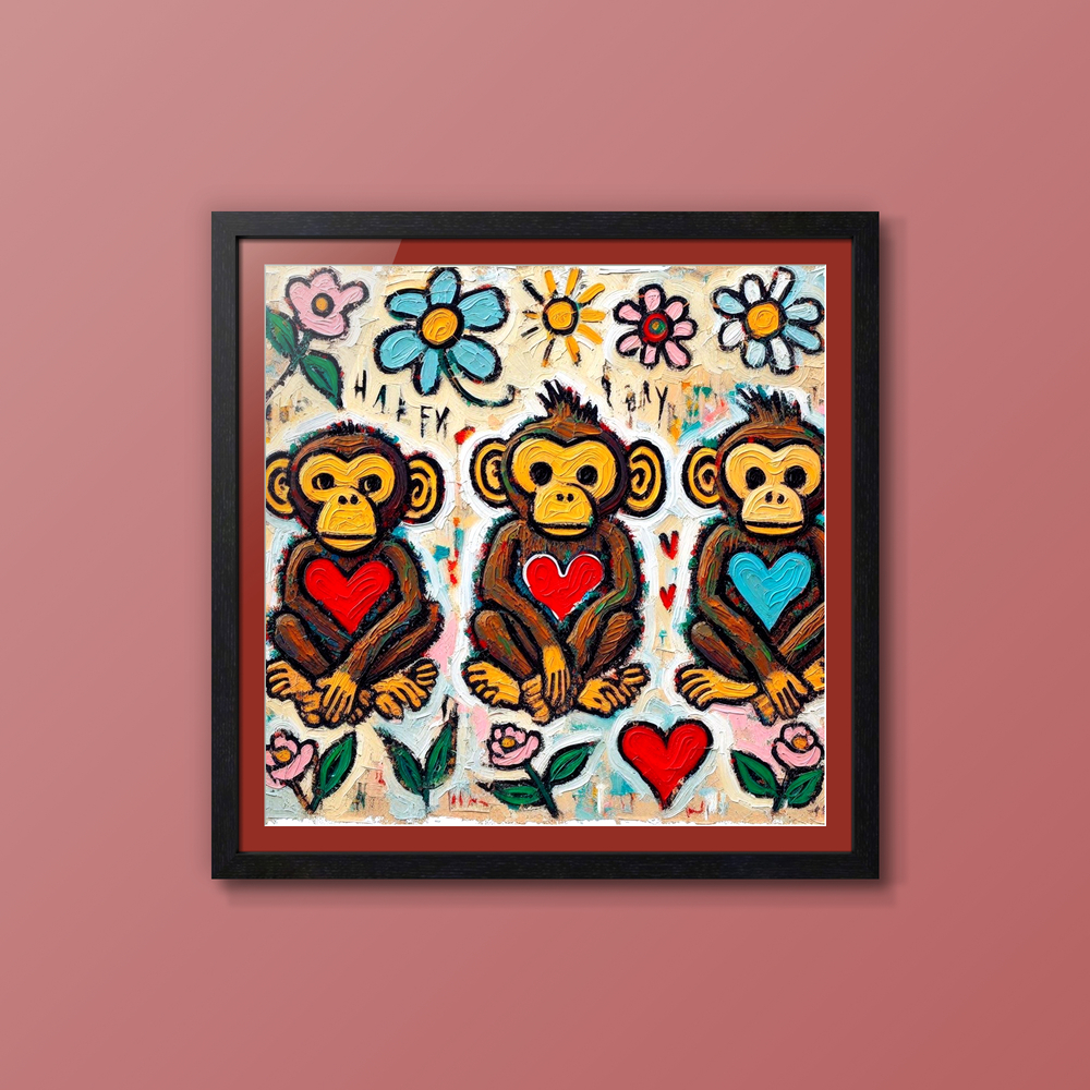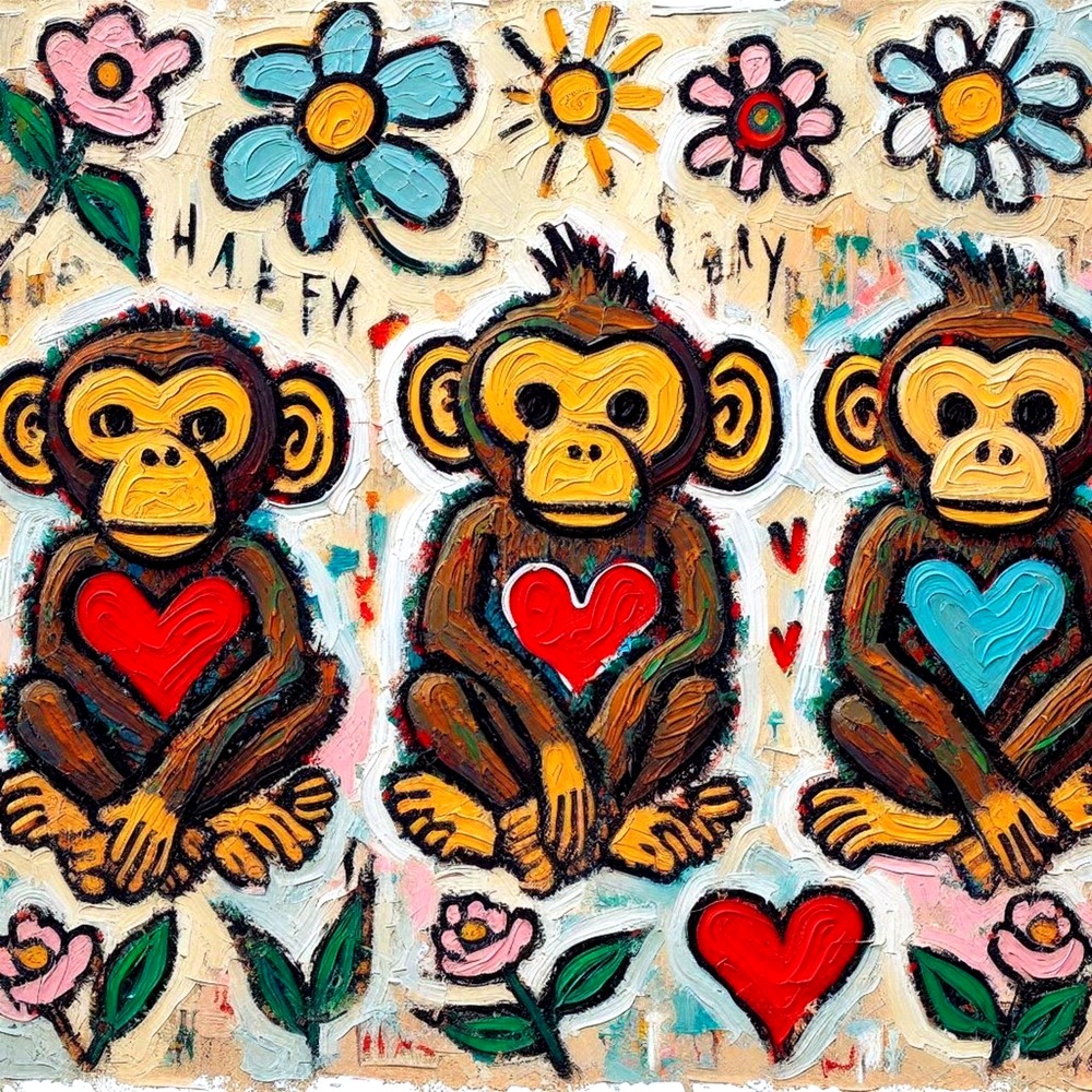三匹の " ハート持ち " サルが花々の中で笑っています。彼らは見る・聞く・言うを超えて、「 感じる 」「 愛する 」「 笑う 」を軸にした新しい三猿哲学を体現しています。背景に咲く太陽と花は、内面の喜びが外界に溢れ出した象徴。