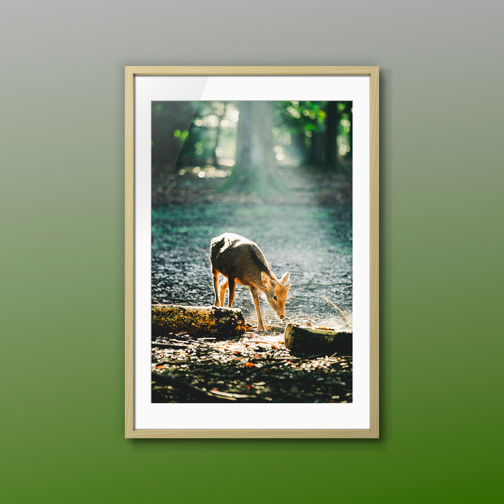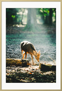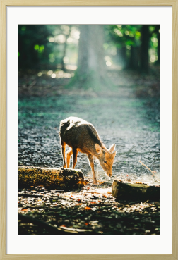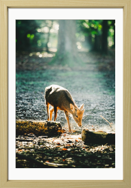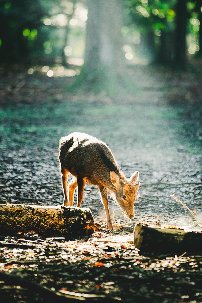 朝日が立ち込める森の中と子鹿 日の光で煙が立ち込める所をしきりに気にしていた瞬間を撮影した