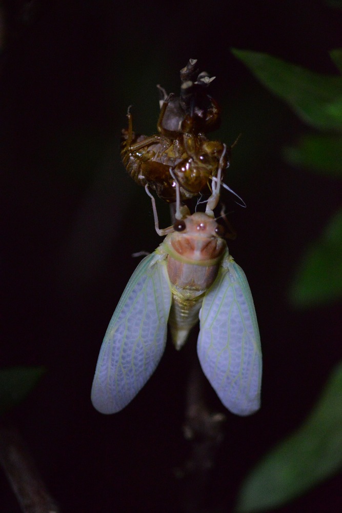 夏の夕暮れに羽化したアブラゼミです。折り畳まれるように萎んだ小さな羽にあっと言う間に体液を送り込んで伸ばす様は神秘的! ぐんぐん伸びる羽と対照的に、大きく動きまるで鼓動を打つようにしてどんどん細く小さくなって行く胴体もまた見物です。