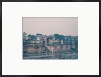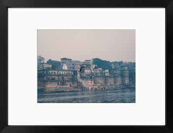 インドの聖地、バラナシ。 「生まれてから死ぬまでの全てが目に見える町」 ガンジス川沿いの町並みを背景に自由に飛ぶカモメです。