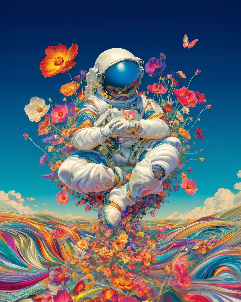 無重力の中、ひとり静かに漂う宇宙飛行士。その足元から咲き広がるのは、記憶と夢、感情が交じり合って生まれた「内なる花畑」。 地球から遠く離れていても、生命の美しさは心の中で息づき続ける。鮮やかな花々は、過去のぬくもりや、未来への希望を映し出すビジョン。宇宙という無の世界に咲いた色彩は、孤独を癒やし、静かな勇気をもたらす。この作品は「花」が持つ力を、現実と幻想の狭間で捉えたイメージであり、見る者人の心にもまた、新たな花を咲かせてくれることでしょう。