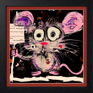 こちらのネズミは、記号と数字、そして言葉の断片を身体にまとう旅人。その目は真実を見つめるというより、" ズレ " を愛し、" 偶然 " を拾い集める存在です。暗がりに浮かぶその姿は、誰かの落書き帳から抜け出したようでいて、どこか哲学的。「 見る人自身がこのネズミの標識となる 」そんな問いかけを含んだ、ポップでシンボリックな作品です。