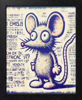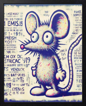 大きな瞳に世界を映す、小さな都市の旅人。このグラフィティ・スタイルのマウスは、まるで人間のように立ち、何かを見つめている。背後には断片的な文字やストリートの記号たち。偶然とズレが交差する都市の片隅で、" 見る " という行為の意味を問いかける。
