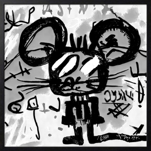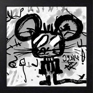 ぽつんと佇むネズミのようなキャラクター。無邪気さと無秩序、意味と無意味の狭間に浮かぶその存在は、都市のノイズと幻想の交差点で生まれた「 ズレ 」の化身です。 こちらの作品は、意味不明な文字列やフラグメント化されたモチーフに彩られながら、「 偶然 」への肯定と、「 混沌 」への愛情を宿しています。見る者に、秩序から外れた先にある自由な視点を問いかけてくる作品です。