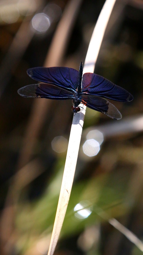 気温が40℃近くになると、トンボも活動が鈍くなります。朝夕の涼しい時間帯や風が吹いている時に比べて草や枝にじっと止まっている時間が長くなり、なかなか飛びわ回ってくれません。