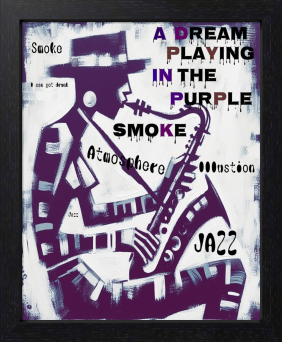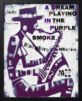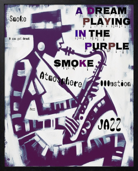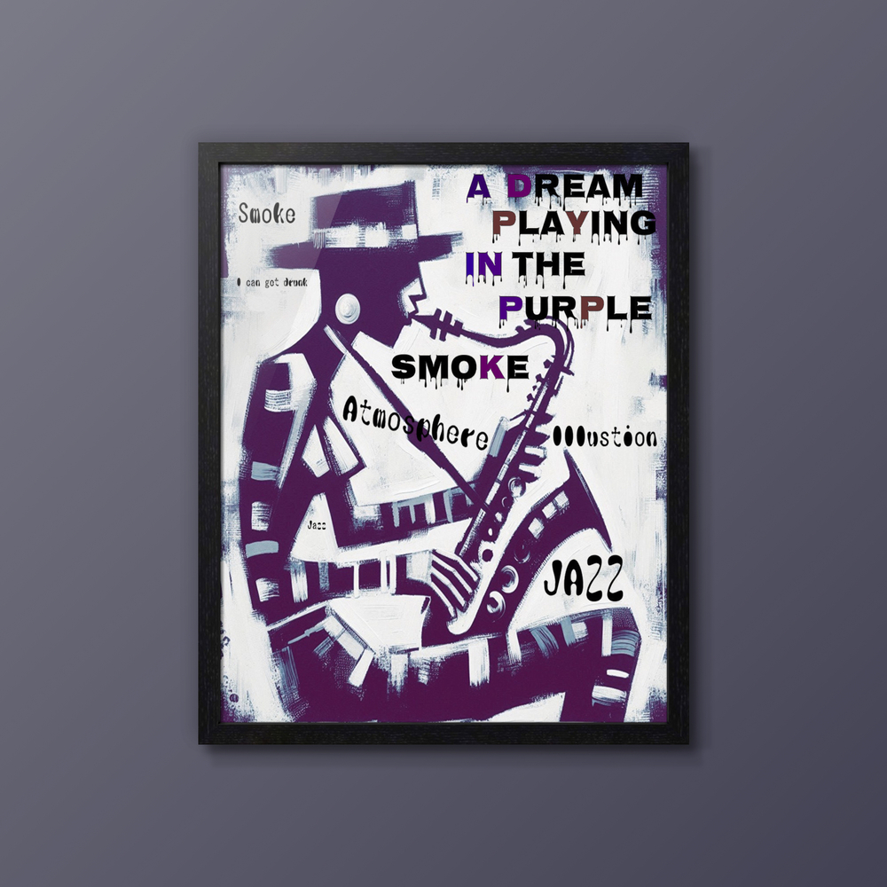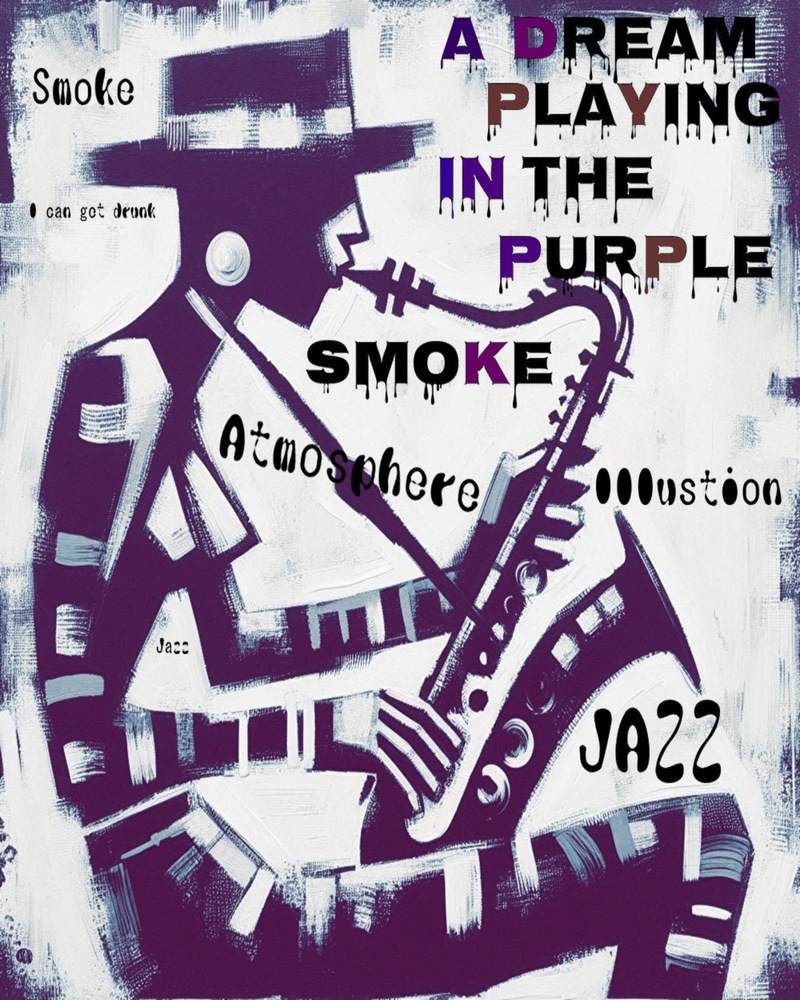 紫の煙の中で奏でられるジャズの幻想・・抽象的なサックス奏者が、言葉の断片とともに煙のように揺らめく。「 Atmosphere 」「 illusion 」「 Jazz 」「 I can got drunk 」などの文字が散りばめられ、視覚と記憶のズレがリズムを生む。これは音ではなく" 雰囲気 " を演奏する作品です。煙に酔うような感覚が、夢と現実の境界を曖昧にする。