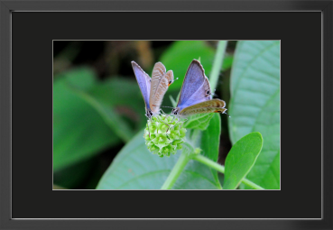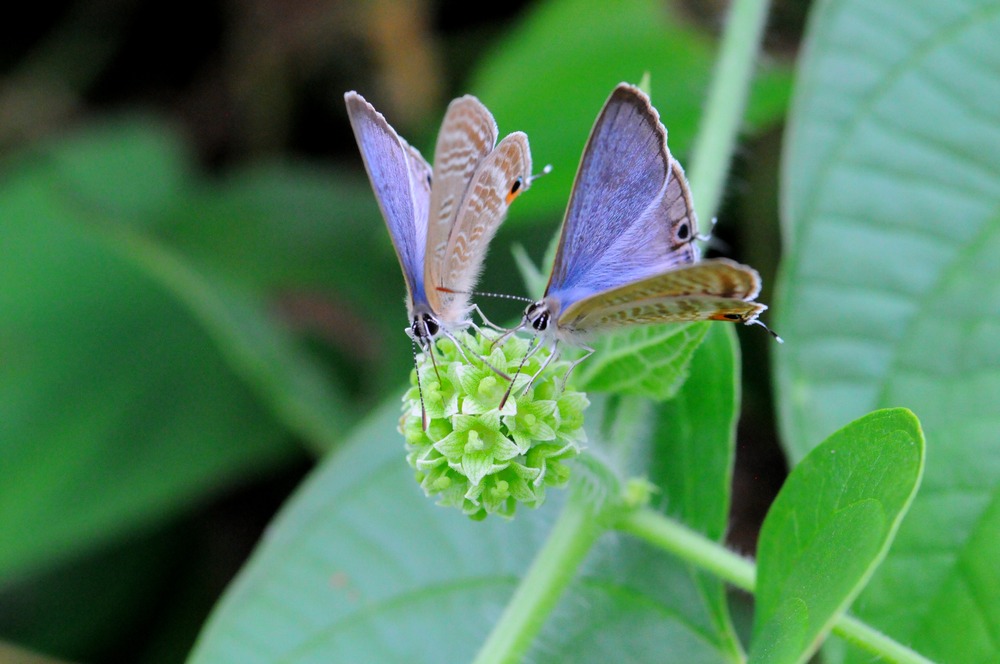 アレチウリの花で吸蜜するツバメシジミの番です。コロニー(葛とアレチウリが密生)には、ヤマトシジミ、ウラナミシジミ、ツバメシジミやオオチャバネセセリ等小さな蝶類や花蜂が多数混在しており、ファインダーから目を離した隙に別の種類に入れ替わることも珍しくない程です。 ヒトにとってはたいして役に立たない「荒れ地」に好んで繁殖する植物ですが、小さな虫たちにとっては数ヶ月に亘って食べ物と隠れ家を同時に提供してくれる貴重な場所です。