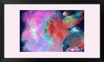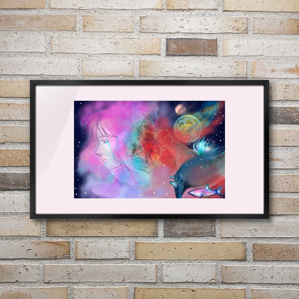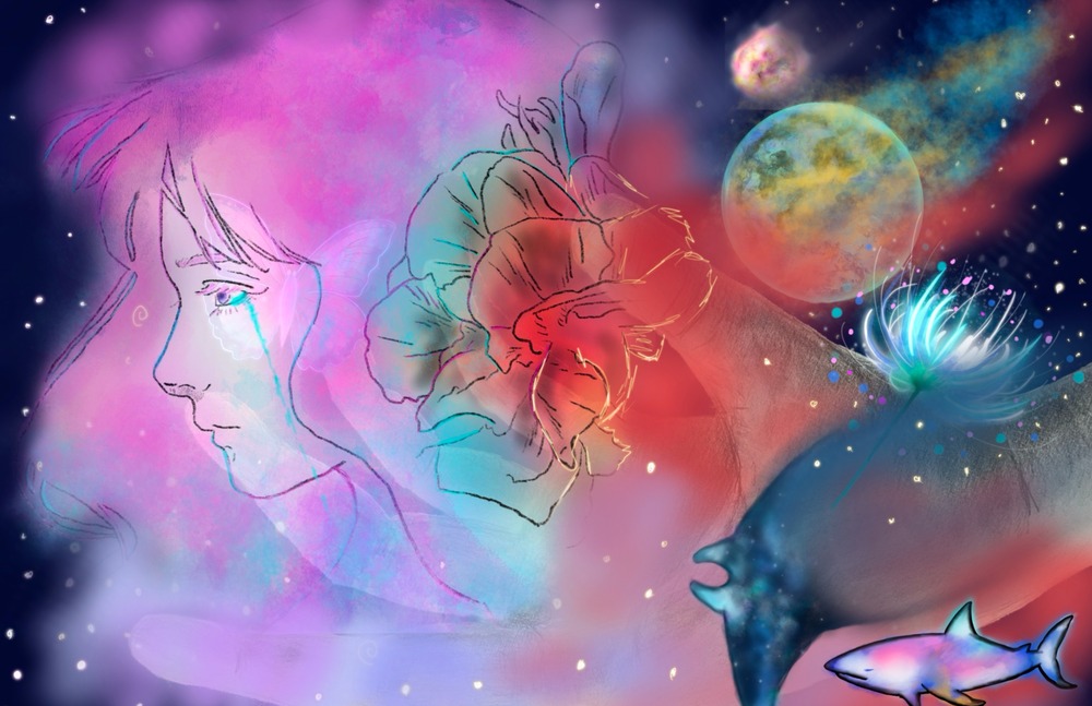 この作品は、夜空を見上げながら流す涙と、海生物が唄うように舞う姿を描いています。無限の星々が織り成す宇宙の中で、女性の心の葛藤や美しさが表現されています。彼女の涙は感情の象徴であり、星々はそれを優しく包み込む存在です。海の中から浮かび上がる感情は、まるで夜空の彼方へと続くようです。