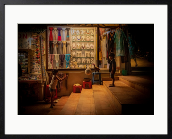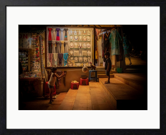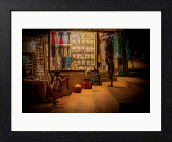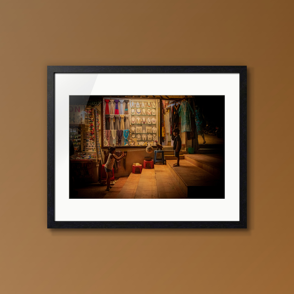 インドの西海岸。 ある小さな港町で。 日が暮れた町角のショーウィンドウの光の元で遊ぶ兄妹。 その光景が美しく、シャッターを押しました。