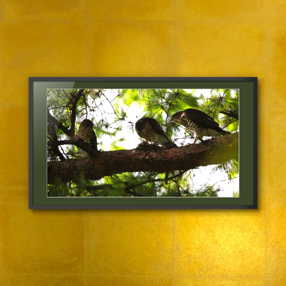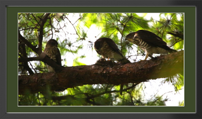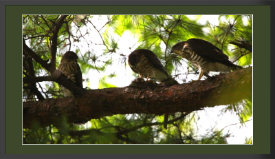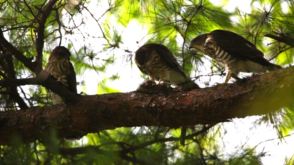 They left the nest several days ago, but they still depend on their mother for food supply. The one in the middle has just got a sparrow and is removing feathers while the others just keep watching.